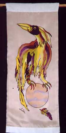 Soft Hangings have a sleeve for a hanging rod sewn at the top border. They are painted on Silk Satin or Habatai Silk. The backing, top and bottom borders are Silk Noil.